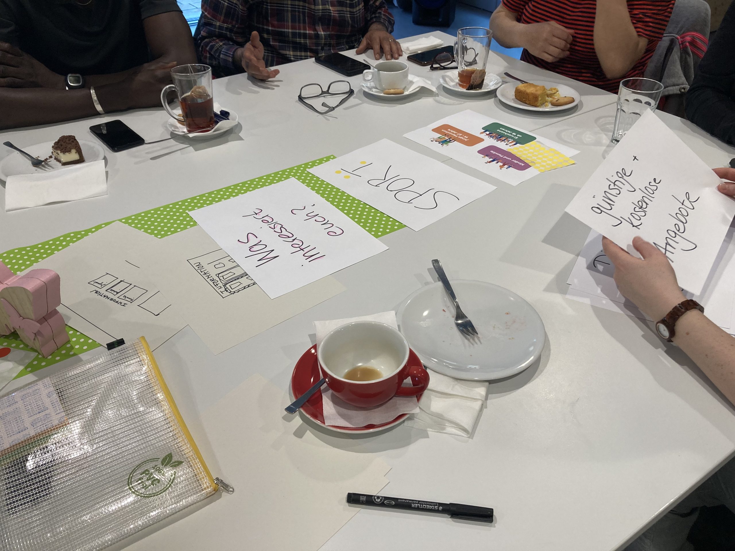 Anfang 2023 fanden dafür zwei Workshops mit Bewohner*innen der Gemeinschaftsunterkunft Münster und Stadtteilakteurinnen im Hallschlag statt. In diesen Workshops wurden gemeinsam Herausforderungen gesammelt und Ideen entwickelt. Das Ziel war dabei die Zugänge zu bestehenden Angeboten für Bewohner*innen aus der Gemeinschaftsunterkunft zu verbessern. Diese brachten dabei ihre Expertise und Ideen ein. Ein großes Thema waren fehlende Informationen zu Angeboten. Aus dieser Zusammenarbeit ist der „InfoPoint Burgi“ entstanden. Der InfoPoint soll Informationen über Veranstaltungen, Kurse und Hilfsmöglichkeiten weitergeben. Außerdem werden die Informationen so aufbereitet, dass alle wichtigen Angaben leicht verständlich sind. Was wird angeboten? An wen richtet sich das Angebot? Wann und wo findet es statt? Muss ich etwas mitbringen oder beachten? Muss ich mich anmelden oder kostet es etwas?