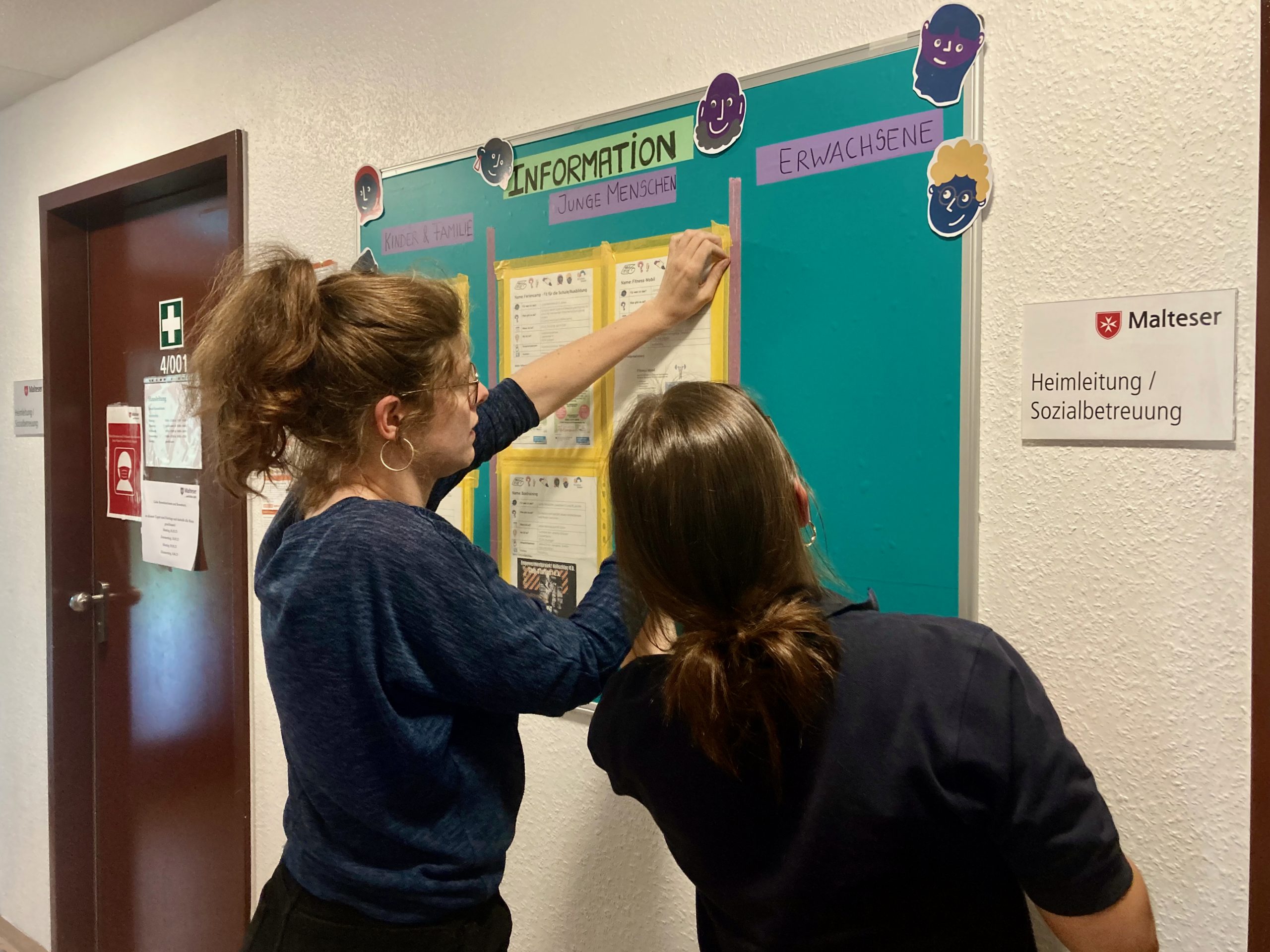 Der erste Ort, an dem Informationen verbreitet werden, ist die Informationswand in der Gemeinschaftsunterkunft. Die Wand wird von den Bewohner*innen und den Sozialarbeiter*innen gepflegt. Die Angebote kommen von Akteuren aus dem Stadtteil und werden von Home not Shelter! gesammelt und allen zur Verfügung gestellt. Es gibt Angebote für Kinder und Familien, Jugendliche und Erwachsene ab 18 Jahren.