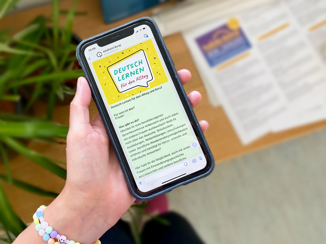 Die aufbereiteten Angebote werden auch online in einer WhastApp-Community-Gruppe geteilt. Dafür gibt es eine eigenes Handy, das von verschiedenen Akteuren im Stadtteil gepflegt werden kann. Pro Woche werden 1-3 Informationen zu Angeboten geteilt. Alle Informationen werden in Textform aufbereitet, so dass sie von den Menschen selbst übersetzt werden können.