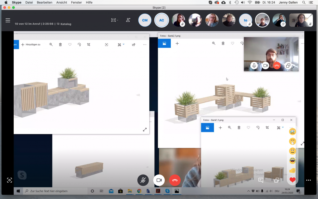 Kurz danach kam das Corona-Virus endgültig nach Deutschland, was weitere physische Treffen erstmal unmöglich machte. Ein neuer Modus der Online-Zusammenarbeit war schnell gefunden. Die Studierenden arbeiteten die Aspekte verschiedener Ideen in intensiven Einzelarbeits-Phasen aus. Wöchentlich wurden die so erarbeiteten Konzepte in mehreren Iterationsschleifen durch gemeinsame Feedback-Momente mit den Dozierenden und dem Design-Team der Stiftung weiterentwickelt. So konnten die Konzepte präzisiert und verdichtet werden. Besonderes Augenmerkt lag dabei auf den zwei Kernnotwendigkeiten für eine zirkulär produzierte Gemeindebank: Einerseits das Design der Gemeindebank selbst, andererseits die notwendigen Abläufe am Wertstoffhof für die serielle Produktion.