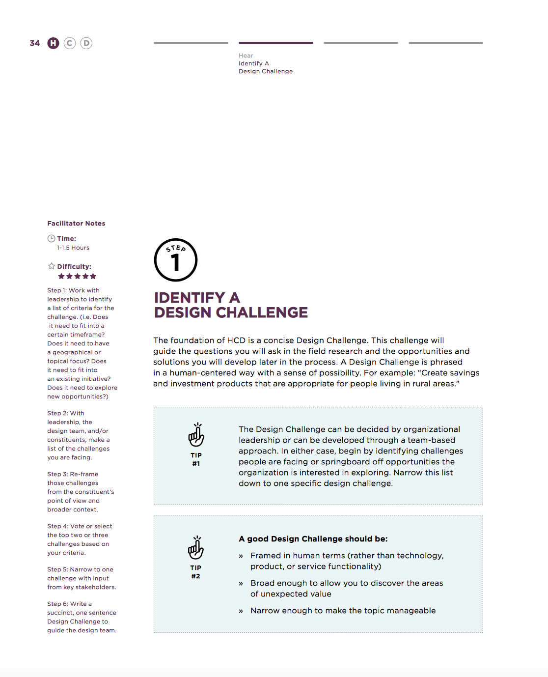 Das kostenlose Toolkit gibt Nutzern eine Schritt-für-Schritt-Anleitung für den human centered design-Prozess und bietet Unterstützung beim Aufbau von Fähigkeiten, wie aktives Zuhören, das Leiten eines Workshops oder die Umsetzung von Ideen.