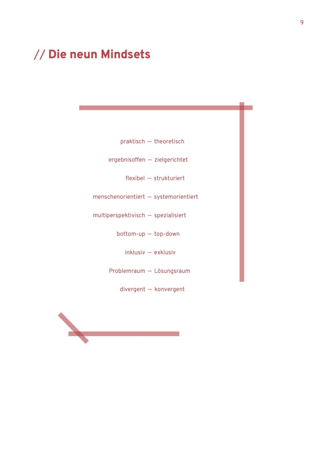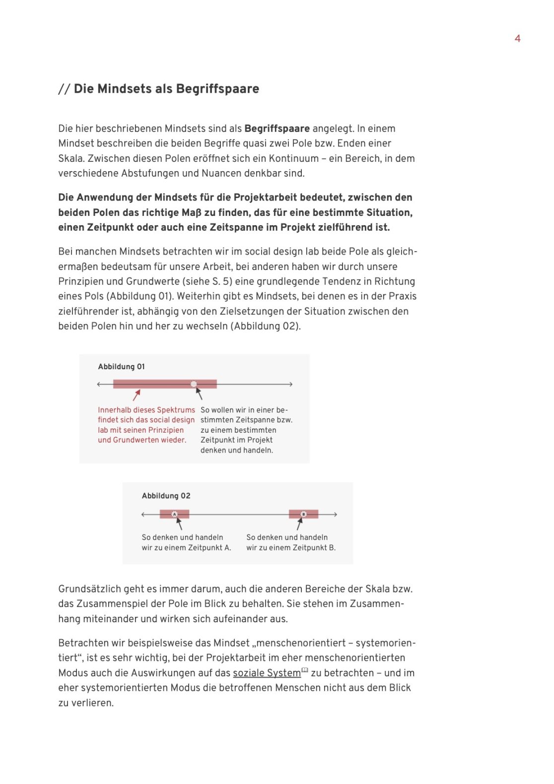 Basierend auf diesen Beobachtungen und mehrjährigen Erfahrungen aus verschiedenen Projektkontexten hat das social design lab eine Sammlung von insgesamt neun Mindsets in Begriffspaaren entwickelt. Diese Sammlung von Mindsets soll über die Arbeit im social design lab hinaus auch andere Projektteams dabei unterstützen, sich mit dem Denken und Handeln in ihren eigenen Projekten aktiv auseinanderzusetzen und das Konzept der Mindsets für die Erreichung ihrer Zielstellungen aktiv einzusetzen.