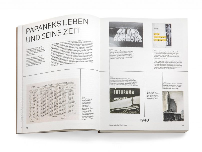 Sein Hauptwerk, die 1971 erschienene Streitschrift „Design for the Real World“, wird dabei ebenso beleuchtet wie seine Entwürfe und sein Engagement für soziale Minderheiten, die sogenannte Dritte Welt und einen schonenden Umgang mit natürlichen Ressourcen. Das Buch dokumentiert unzählige Fotografien, Objekte, künstlerische Arbeiten und Entwürfe, Zeichnungen, Briefe und andere Materialien, die teilweise zum ersten Mal veröffentlicht werden. Auch Papaneks enger Austausch mit Zeitgenossen wie Richard Buckminster Fuller, George Nelson und Marshall McLuhan wird untersucht. Ergänzt wird das Buch um Werke etwa von Tomás Saraceno, Catherine Sarah Young, Gabriel Ann Maher, Thomas Thwaites und Forensic Architecture, sowie Flui Coletivo und Questtonó. Diese zeitgenössischen Arbeiten zeigen: Papaneks Deutung von Design als Werkzeug für gesellschaftlichen Wandel ist aktueller denn je und prägt bis heute die Debatten über Social Design, Critical Design und Design Thinking.(Vitra Design Museum)