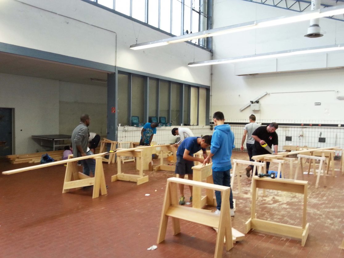 Neben der Hans Sauer Stiftung unterstützten das Projekt in der Anfangsphase die Akademie der bildenden Künste München (Prof. Maria Auböck/Lehrstuhl für Gestalten im Freiraum), die Landeshauptstadt München sowie der Caritasverband der Erzdiözese München und Freising. In einer zentral gelegenen Unterkunft wurden ab März 2016 über mehrere Monate hinweg Bedarfsmöbel und Außenraummöblierung geschreinert. Als niedrigschwelliges Beschäftigungsangebot und Möglichkeit, sich mit anderen auszutauschen, wurde das Angebot gut angenommen und bereicherte die Unterkunft sowohl infrastrukturell als auch sozial. Auf Grund der Schließung der Unterkunft, musste bald eine neue Wirkungsstädte gefunden werden.