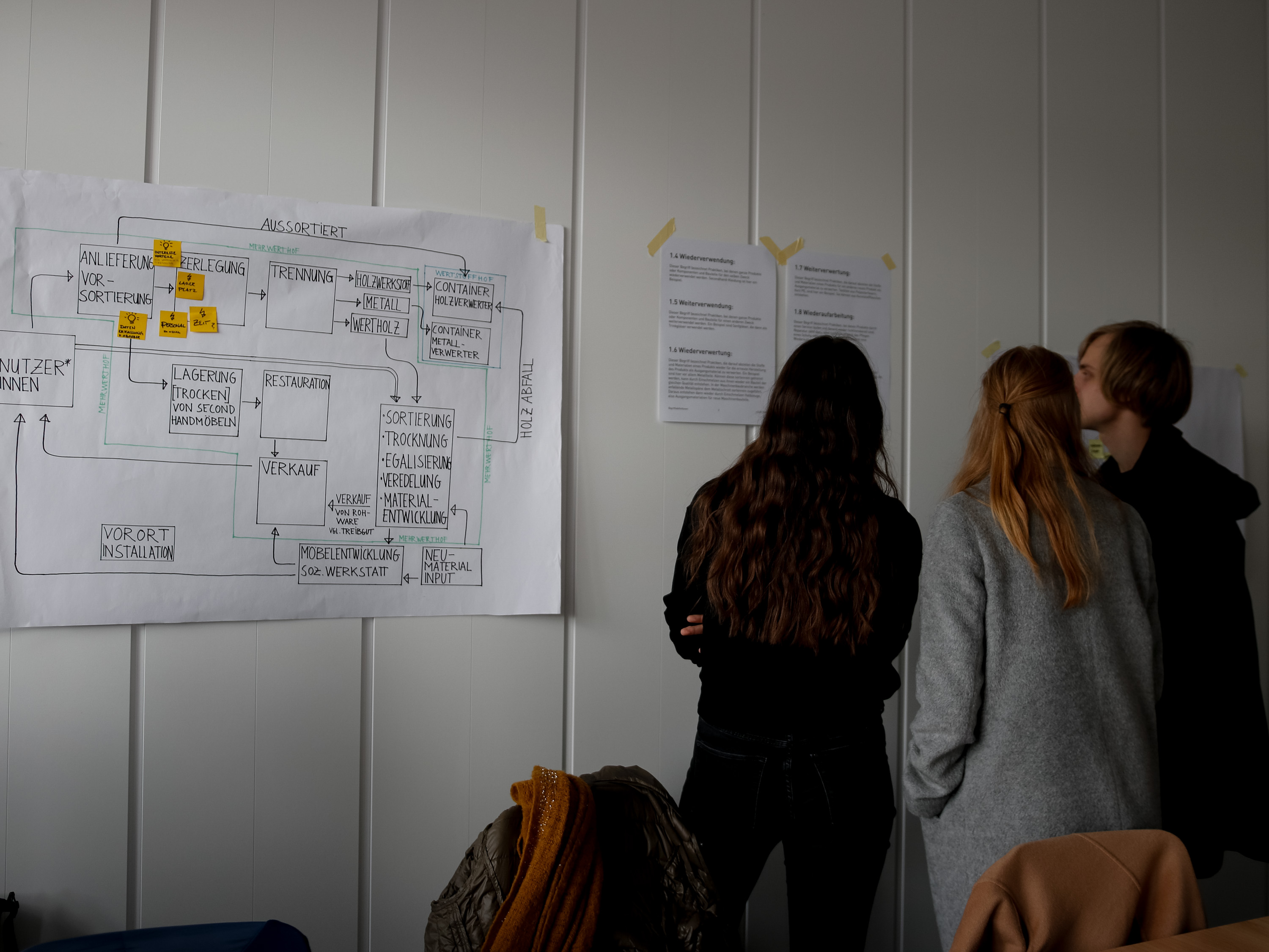 Bei einem Rundgang über den Wertstoffhof wurden bereits lagernde Ressourcen, insbesondere das Wertholz, begutachtet, und die verschiedenen Sammlungsstationen erklärt. Im Anschluss trugen die Teilnehmer*innen das bisher Gesammelte und Reflexionen dazu zusammen. Gemeinsam wurden auch Erwartungen an den Prozess und die Arbeitsweise besprochen. Als sehr hilfreich erwies sich ein Kriterienkatalog zu Begriffsdefinitionen rund um die Thematik der Kreislaufwirtschaft. Dabei kam in den Gesprächen insbesondere dem möglichen Narrativ, dass die zirkulären Produkte eine Geschichte erzählen und mit sich tragen, eine große Bedeutung zu.